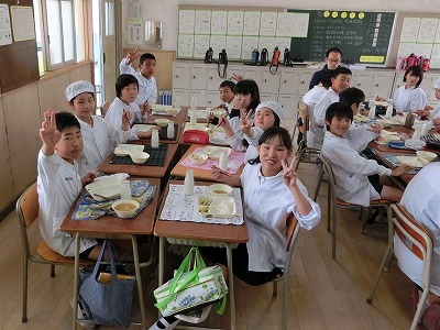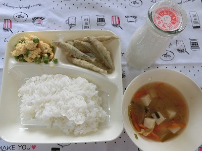 きびなごの天ぷらは、7〜8cm位のきびなごを頭から尻尾まで丸々天ぷらにしていました。衣はサクッと、骨も気にならずに食べることができました。1年生も「おいしい」と言って、たくさんお替りしていました。