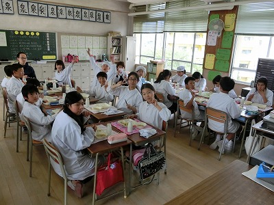 えんどう豆の卵とじは、今が旬のえんどう豆が使われています。この時期以外では、冷凍のえんどう豆を使用するのですが、今日は、生のえんどう豆がさや付きで配送されて、給食調理員さんが、1つ1つ手で、さやからえんどう豆を外して、茹でてから使用します。本校では500人前以上の調理です。給食調理員さんは、大変な作業だったことでしょう。食べたとき、いつもより豆の香りと甘みが広がり、柔らかく、おいしくいただくことができました。