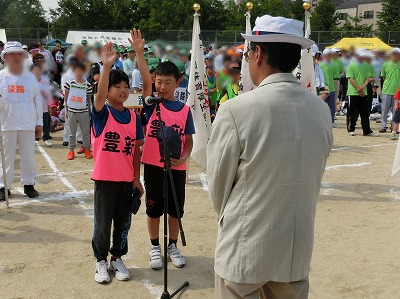 今年は1番くじを引いた豊新地区が選手宣誓の担当です。6年生の2名が堂々と選手宣誓をしてくれました。