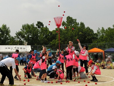 孫と一緒(玉入れ)では小学生10人と地域のお年寄りの方5名での参加です。みんな楽しそうにカゴをめがけて玉を投げ入れていました。
