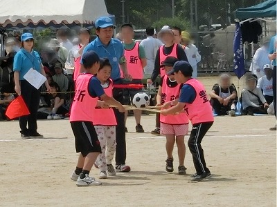 タンカリレーでは子どもたちも息を合わせてバランスを取りながらボールを運びましたが、残念ながらこれも決勝に残れませんでした。