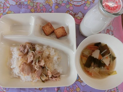 厚揚げのしょうが醤油がけは、「しょうが」がどうかな?、苦手かな?、と思ったいましたが、しっかりした味付けで食欲をそそり、子どもたちもお替りをしてたくさん食べていました。