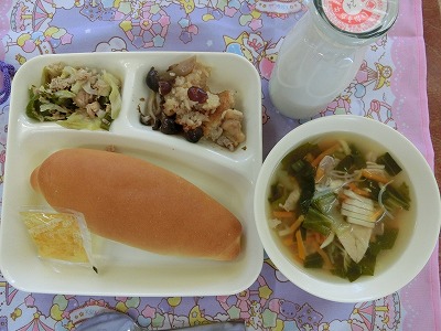 金時豆の中華おこわは、具材に金時豆、、鶏肉、しめじが入っていました。もち米のモチモチした食感がよく、味もしっかりしていておいしかったです。1年生の子どもたちにも評判でした。