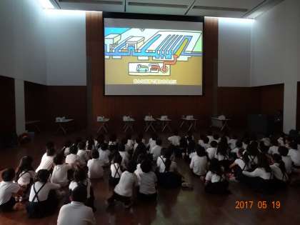 屋外での見学を終えた後、涼しい多目的ホールで学習をしました。