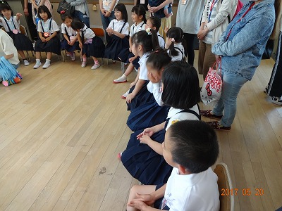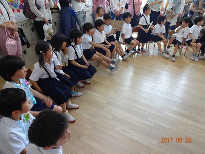 音楽に合わせてボールを回し、音楽が止まった時にボールを持っている児童と保護者がコミュニケーションをとるゲームです。保護者のみなさんには、自分のお子さんと違うお子さんの後ろに立っていただきました。好きな色や好きな食べ物などを聞いて楽しくゲームを進めることができました。