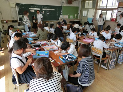 リンク機構を1cmの幅にカットした厚紙とホチキスとで作成し、そこに思いのままに描いたイラストを組み合わせ、動くおもちゃを作りました。