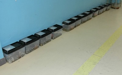 ケンカしてはいけないので、1匹ずつ飼育ケースに分けています。