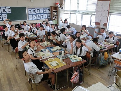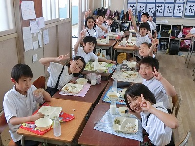 抹茶ういろうは、給食調理員さんのお手製です。ういろうをなめらかな食感、仕上がりにするために、白いんげんのペーストが加えられていました。子どもたちには人気で、まわったクラスは食缶が空っぽでした。1年生も喜んで食べていました。