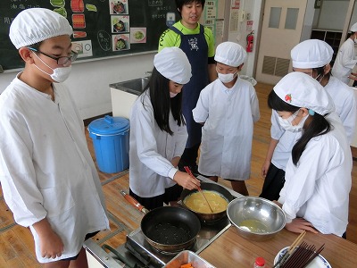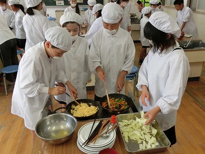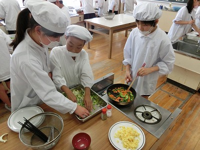 野菜炒めは、火の通りにくい、にんじんから炒め、ピーマン、キャベツと時間をずらして入れていきます。