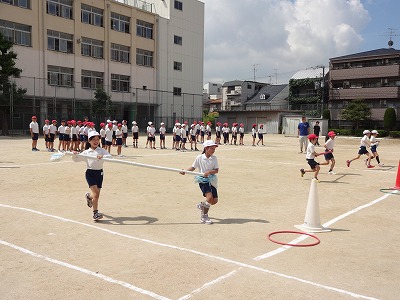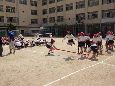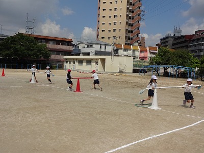 長い棒を二人で持ち、途中2か所でくるりと1回転します。