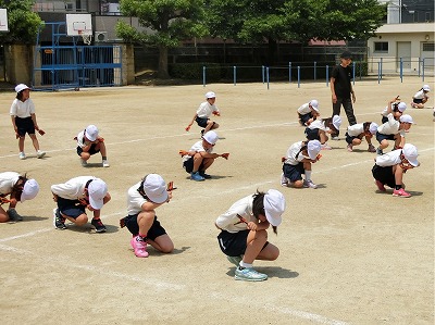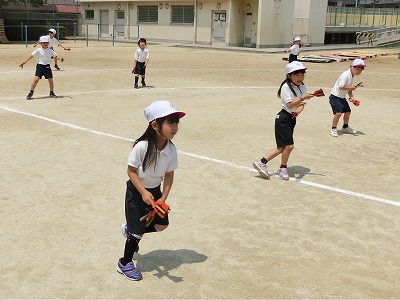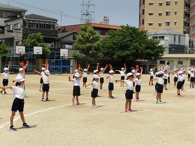 子どもたちも「鳴子」を手にすることがとてもうれしいようで、運動場で暑い中ですが、元気よくダンスの練習をしていました。