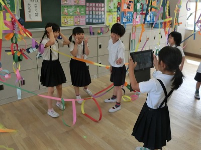 班に1台、タブレットを渡し、各自が、自分の気に入ったアングルから作品を撮影しました。また、作品をバックにお友だちの記念写真を撮り合ったりもしました。