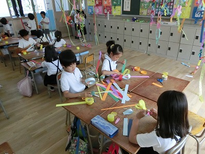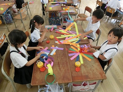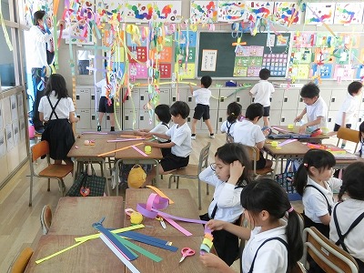 このクラスでは「つないで つるして」という単元で、色画用紙を細長く切ったものを、各自が、また、班で相談・協力して、どんどんとつなげていき、それを先生が架けてくれたヒモに吊り下げていきました。