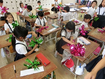 2年生が運動会の団体演技で使用する「ポンポン」を作っていました。