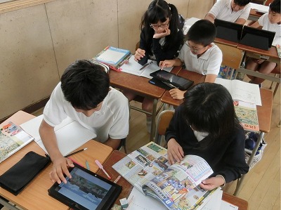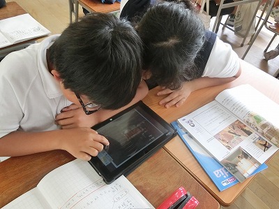 今日は、先生の作成した平安時代に関するスライド資料を、無線で子どもたちのタブレットに送信し、子どもたちはそのスライドに、教科書や資料集などから得た情報を、ペン機能を用いて書き込んでいました。
