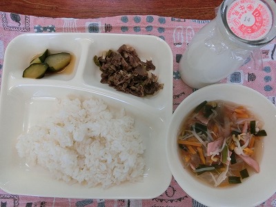 きゅうりの辛みづけは、乱切り下きゅうりを塩ゆでし、砂糖、しょう油、ラー油で味付けされていました。辛み漬けということでしたが、1年生でも問題なく食べられました。