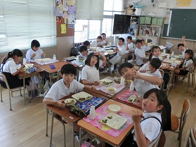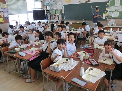 チンジャオニューロウスーは、中国語で「青椒(チンジャオ)」はピーマン、「牛肉(ニューロウ)」は牛肉、「絲(スー)」は細切りという意味です。よって今日は牛肉の細切りが入っていました。タケノコも入っていて、たれもおいしく、子どもの中には、ごはんにかけて丼にして食べている子もいました。