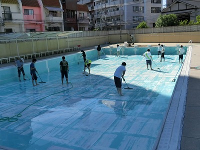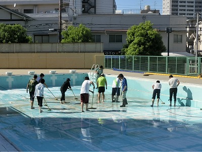 放課後はすべての先生方がプールに集まり、たわしなどを使ってていねいに洗っていきました。