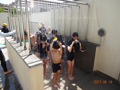 準備運動をした後、地獄のシャワー(かなり冷たいので子どもたちはそう呼んでいます)を浴びてプールに入りました。