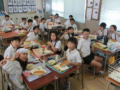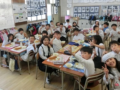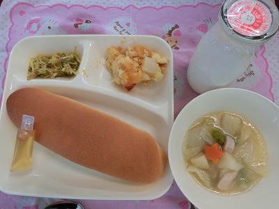 鶏肉と野菜のスープ煮は、鶏肉、ジャガイモ、玉ねぎ、キャベツ、ニンジン、グリーンピースをチキンスープで時間をかけて煮込まれていました。たくさんの野菜から甘みが出ていておいしかったです。また、今日も「星・ハート・お花・クマ」のラッキーニンジンが入っていました。でも、相変らず「グリーンピース」が苦手な子がいます。昔からですね。