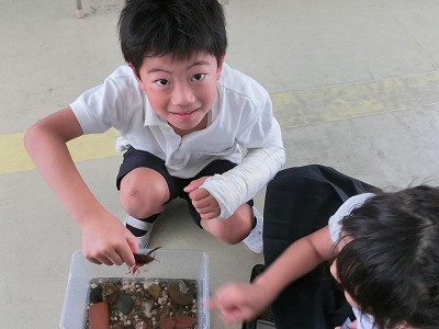 お掃除後も、ザリガニを手に取って容器に戻せずにいました。