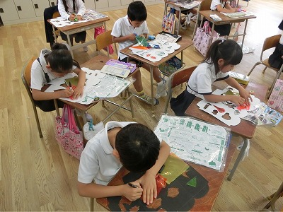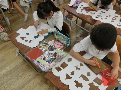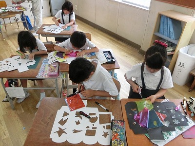 今取り組んでいる題材は「ひかりのプレゼント」で、2年生になって使用を始めたカッターナイフを用い、台紙部分に好きな模様を切り抜いていきます。子どもたちは、三角、四角、星、ハート、車、ロケット、お花などを下書きし、その線に合わせて、ゆっくり、ていねいにカッターナイフの刃を動かし、カットしていました。