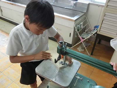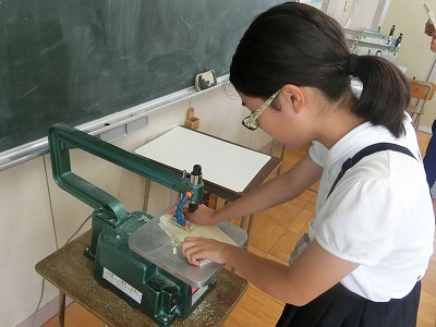 下絵が描かれた側板2枚は、セロテープで固定し、2枚一緒に電動糸のこ盤で切断していきます。板が厚い分、切断も難しく、特に、曲線部分は慎重に作業を進めていました。