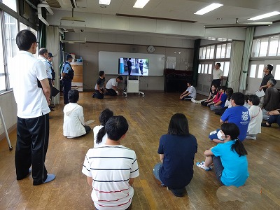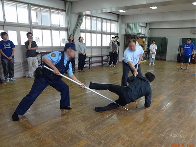 不審者が侵入し、先生方が対応し、取り押さえるところを撮影したビデオ映像をを再生し、要所要所でストップし、先生方のとった行動を振り返りながら、刑事さんからのていねいな説明を受けました。
