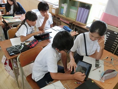 後半は2人での作業です。発表ノートを起動し、動画の画面をキャプチャーしたものを張り付けていきます。タイトルや説明の文字(文章)を入力しているチームもありました。作業時間は10分です。集中して発表用資料を作成していました。