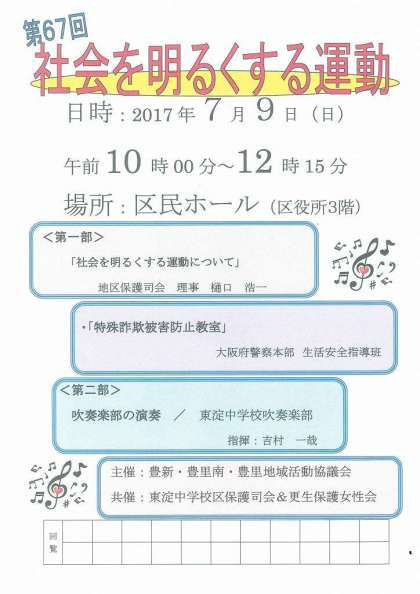 今年度より、東淀中学校区の豊新、豊里、豊里南の3地域合同での開催となりました。そのため、会場も区民ホールに変更です。