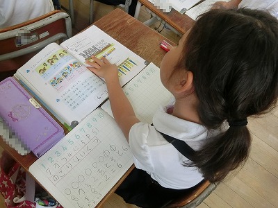 授業の冒頭では、4−3=、7−4=、8−6=などの計算問題の答え合わせしていました。ほとんど全員の子が満点でした。