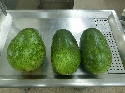 この大きさの冬瓜8個で、豊新小学校の約500食分の、今日の冬瓜を使った献立を作るそうです。