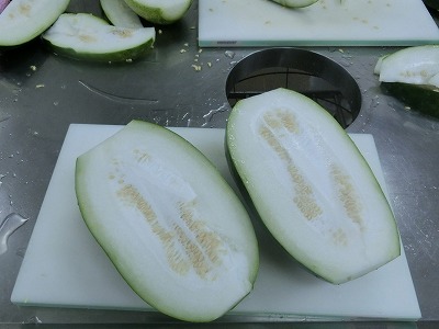 今日の給食の食材ですが、とても珍しいので、朝の時間帯に給食室へ行き、給食調理員さんに見せていただきました。新鮮な冬瓜で、調理前には、表面にきゅうりと同じようにトゲトゲがあったそうです。