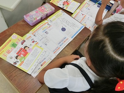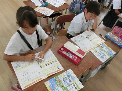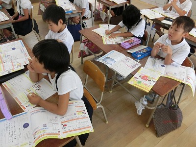 2年生では、郵便局よりいただいた「手紙の書き方」というリーフレットを使って、「暑中見舞い」を書く学習をしていました。