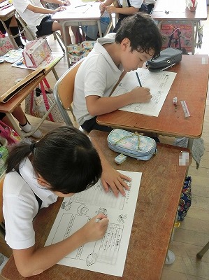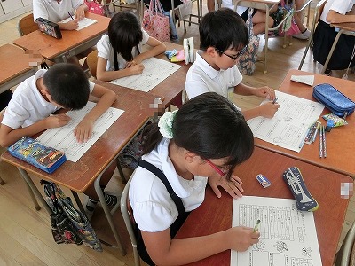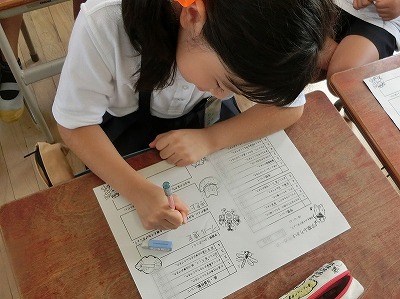 3年生のこのクラスでも、1学期の振り返りをプリントを使って行っていました。