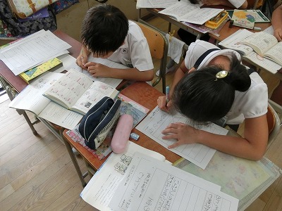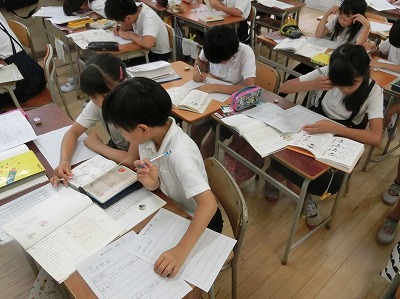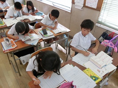このクラスでは「ことわざブック を作ろう」という単元を学習していて、今日はお気に入りの「ことわざ」について、ことわざ辞典や国語辞典で、その「ことわざ」の意味を調べ、次に、その「ことわざ」を使った短文を作り、プリント(ことわざカード)にまとめていました。