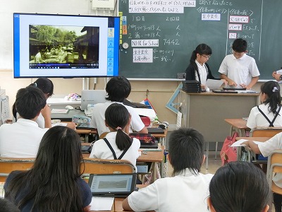 発表は、自分たちのタブレットを無線接続し、大型モニタに作成したスライドを映し出します。「町づくり」チーム、「戦い」チームがそれぞれ発表し、最終的に自分の意見を決定します。