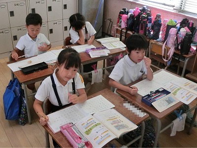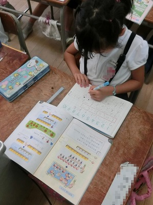 今日はその「ちがいは いくつ」という部分で、例題(りんごとみかんの数の違い)では、ノートに絵も使って考え方、答えの求め方をていねいに書いていました。