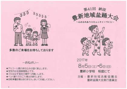 夏休み中の8月5日(土)・6日(日)は、本校の校庭にて、豊新地域の盆踊り大会が実施されます。