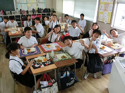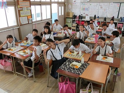 冷凍みかんは、今季初めてです。今日も暑い日だったので、子どもたちにとっては最高のデザートとなりました。配膳時にはみかんの表面には氷がついていて、食べるときになっても、まだ、凍ったシャーベット状でした。一気に食べて頭が「キィーン」と痛くなっている子もいました。1年生にとっても給食で初めてです。喜んで食べていました。