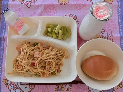 シーフードトマトスパゲッティは、「エビ・ツナ」たっぷり、ベーコンもたっぷり入ったスパゲッティで、子どもたちもとても喜んで食べていました。トマトソース系ではなく、カットしたトマトを一緒に炒めたものでした。