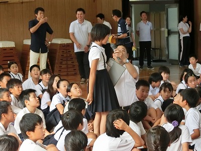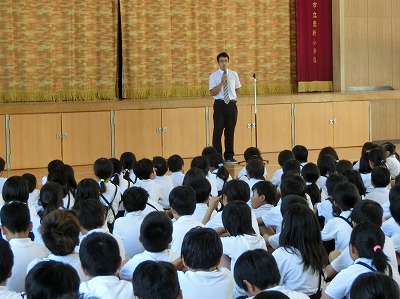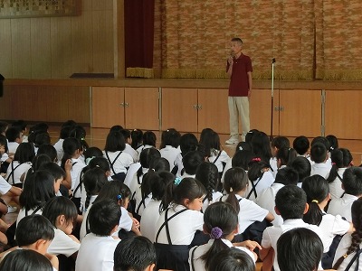 みんなへのインタビューの後は、宿題は計画的にしましょう、夏休みを思いっきり楽しんで、たくさんの思い出を作ってほしい、家族の一員としてお手伝いをしてほしい、事故やトラブルに巻き込まれない、特に水に関する事故に注意すること、のお話をしました。