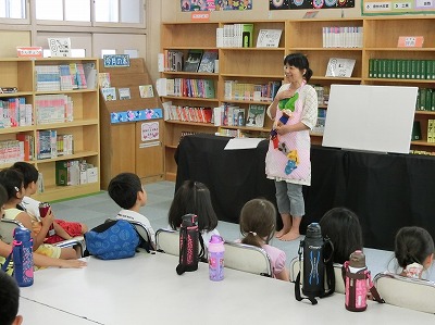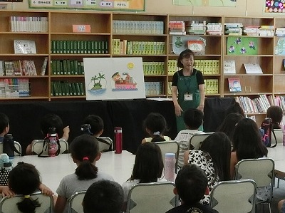 「がらがらどん」による『夏休みおはなし会』が10時から図書室でありました。また、今日は「東淀川区絵本読み聞かせ事業」よりボランティアさんもお手伝いに来てくださりました。