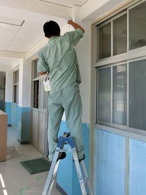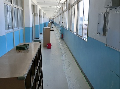 校舎の外壁塗装は、業者さんですが、校内の廊下や階段部分の塗装は、管理作業員さんが子どもたちのいない夏休みの期間を利用して、塗装をしていただいています。