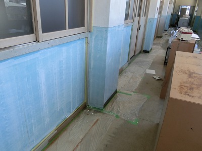 下足入れや傘立てなども移動し、マスキングテープも貼って、下地塗りの作業でした。