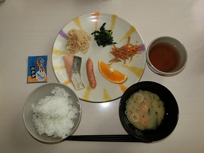 焼き魚、ウインナー、ほうれん草のおひたし、切り干し大根、味噌汁、ふりかけにデザートにオレンジもありました。