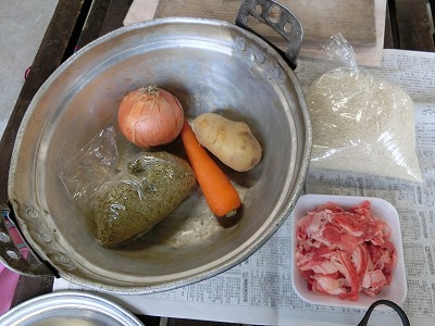 材料は、牛肉、玉ねぎ、ジャガイモ、ニンジン、お米、カレーのルーです。