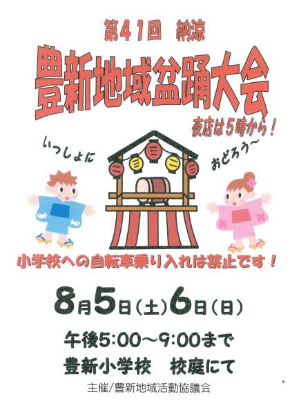 この週末、夏休み中の8月5日(土)・6日(日)は、本校の校庭にて、豊新地域の盆踊り大会が実施されます。