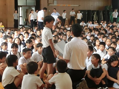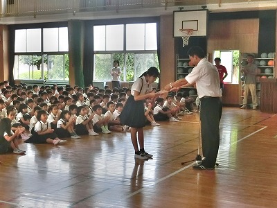 講堂では、校長先生からまず始めに、新しく転校してきた児童(1年生)の紹介も行いました。