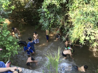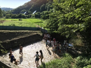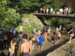 女子は川遊びの前のプログラムが時間がかかってしまい、水着に着替える時間がなく、洋服での参加となったため、水着男子たちに散々川の水をかけられビチョビチョに。